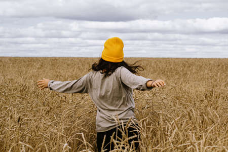 a young girl in a yellow hat and grey sweater runs across the field of wheat and stroking ears