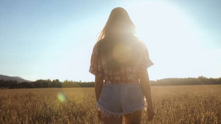Back view of blonde woman who stands toward the sunset in a wheat field with raised hands