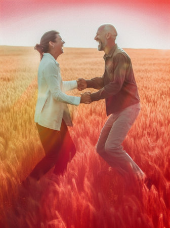 Generative AI : Couple in love jumping on a wheat field Concept about people love and lifestyle