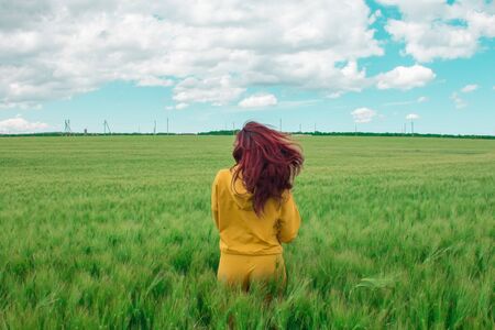 A girl with thick red voluminous hair in a wheat field is happy and enjoys fresh air and freedom. Harvest festival.