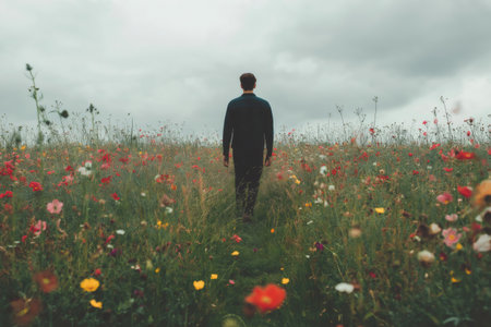 Rear view of entrepreneur walking away through colorful flower field under cloudy sky, enjoying freedom and nature