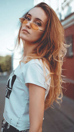 Fashion portrait stylish pretty woman in sunglasses posing in the city, street fashion. You look cool on white t-shirt