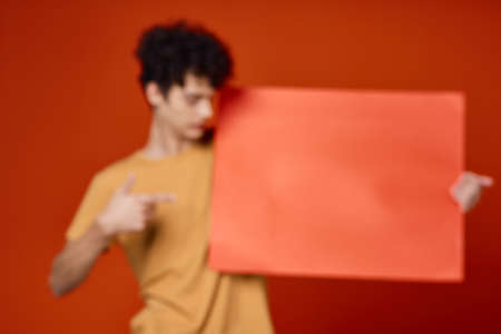 guy with curly hair studio advertising mockup red background
