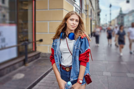 Portrait of a pretty attractive sexy young woman with natural makeup with beautiful eyes in a fashionable denim jacket in a black stylish dress. american girl walking in city