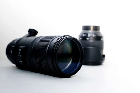 High-aperture camera lenses with reflections, low key image. High-quality photographic lens close photographed.