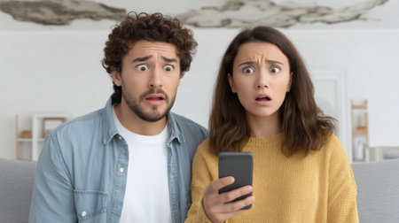 A surprised couple shares a moment of astonishment as they look at a smartphone together. Their expressions show disbelief in a cozy living room setting.