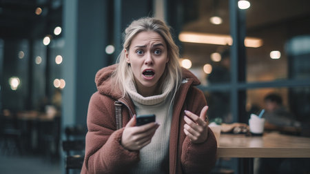Photo of surprised blonde young woman with surprised facial expression uses mobile phone for surfing internet reads terrible news on web page opens mouth from wonderment : Generative AI