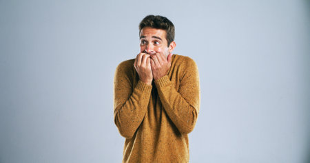 Scared Caucasian guy biting his nails in terror over grey studio background. Young man feeling terrified, suffering from fear or shock, having panic attack. Expressing negative emotions concept