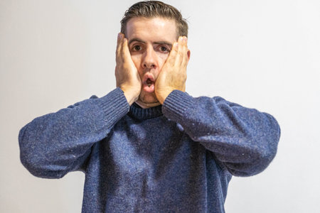 Close-up of a man with hands on his face, eyes wide in shock and fear, capturing an intense emotional reaction.