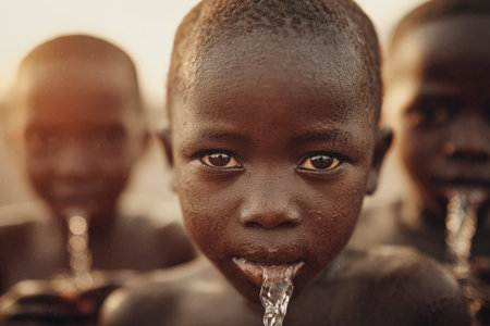Young African boy is drinking water from a stream, with two other children nearby, highlighting the significance of hydration and the beauty of nature