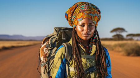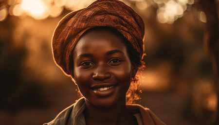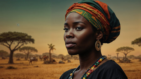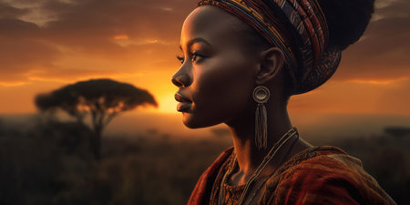 Generative AI Image of African Woman Wearing Headband in Savanna at Sunset Sunrise