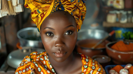 Close-up portrait of a young Nigerian female cook wearing a vibrant traditional headwrap, with a serious expression in a kitchen setting.
