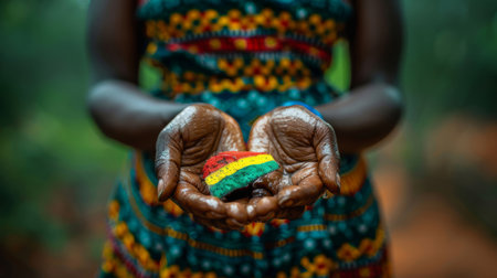 Close-up of an African woman's hands holding a colorful small South African flag, symbolizing national pride and heritage.