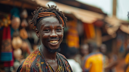 A happy young man with traditional tribal face paint smiles brightly in a bustling African market. His attire showcases vibrant cultural heritage.