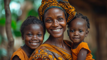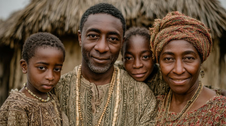 A family portrait featuring african traditional outfits, showcasing unity, culture, and heritage outdoors.