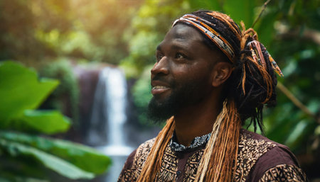 Portrait of a young African man with dreadlocks in front of a waterfall