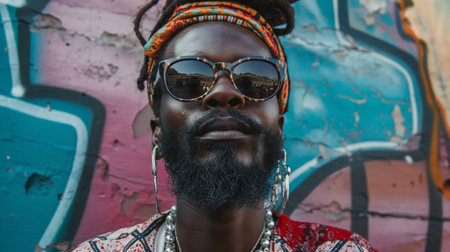 A man stands confidently, wearing an eye-catching outfit with bold patterns and layered necklaces. His sunglasses reflect the clear sky, adding to the striking aesthetic of the urban atmosphere.