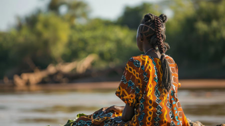 A peaceful moment of a Fulani girl by a riverside, braiding her hair with intricate patterns passed down through generations, reflecting the importance of beauty and tradition in Fulani culture.