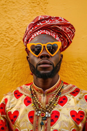 Man in traditional attire, heart-shaped glasses, cultural fusion, vivid portrait
