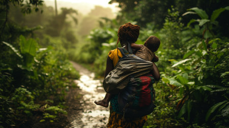 A mother carrying her malaria-stricken child on her back in a rural village at dawn AI generated