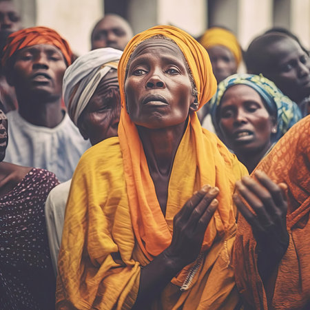 A group of African devotees wearing colorful clothing and singing hymns