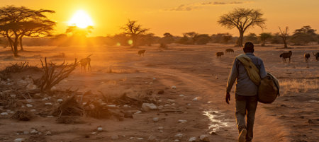 An unidentified man walks through the savannah at sunset in Tanzania.