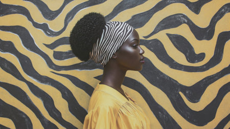 A woman with a bold hairstyle poses against a vibrant yellow and black zebra-striped wall