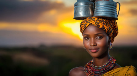 A woman wearing a colorful head scarf and a necklace is holding two metal containers on her head. The scene is set against a backdrop of a sunset, creating a warm and inviting atmosphere