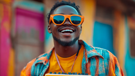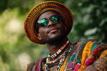 A man showcases his cultural heritage by wearing colorful traditional clothing, coupled with a wide-brimmed hat and stylish sunglasses.
