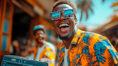 Cheerful black duo in colorful outfits expressing happiness. AI generative.
