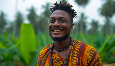 Portrait of an African man in traditional clothes against the background of nature.