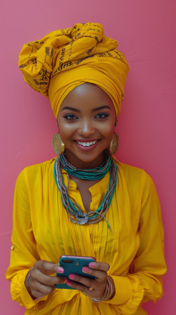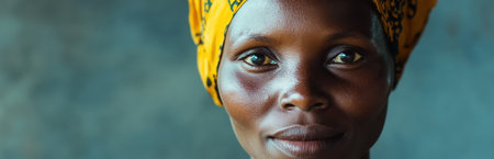This captivating close-up portrait features a smiling woman in a vibrant yellow headwrap, highlighting her joyful expression and natural beauty against a textured background.