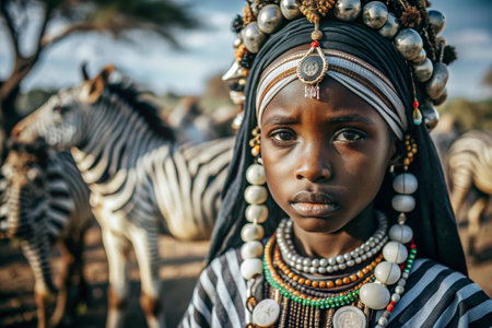 A beautiful black African girl in a traditional African national costume. Against the background of a zebra. The portrait symbolizes the traditions and beauty of the African people.