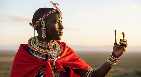 African male adult in traditional maasai attire taking selfie at sunset