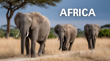 A stunning African landscape features majestic elephants walking gracefully among acacia trees under warm sunlight. This vivid savannah captures the beauty of wildlife in its natural habitat.