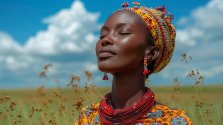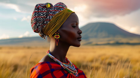 Juneteenth, a day for freedom. A beautiful black woman wearing traditional Maasai attire, standing in the Serengeti. She is adorned with colorful beaded necklaces and earrings