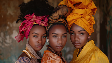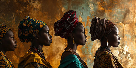 Three women wearing colorful head scarves stand in a row. The women are dressed in traditional African clothing and are wearing gold and silver jewelry. Concept of cultural pride