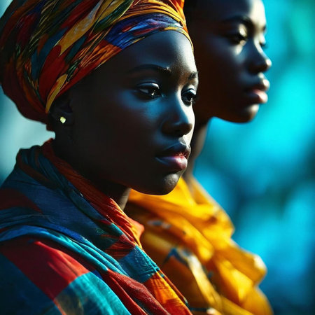 Two women wearing colorful headdresses and standing next to each other, AI