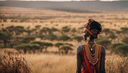 A portrait of an African woman in traditional attire gazing at the vast savanna. She stands amidst tall grasses, her gaze directed towards the distant horizon, conveying a sense of peace and tranquility.