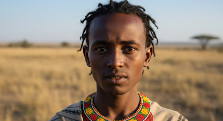 Portrait of a young African man in traditional clothes in the savanna