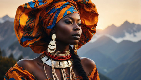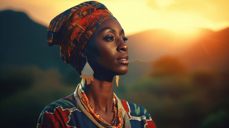 Beautiful african woman in traditional clothing and headscarf at sunset