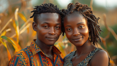 A family dressed in traditional african attire showing unity and happiness outdoors.