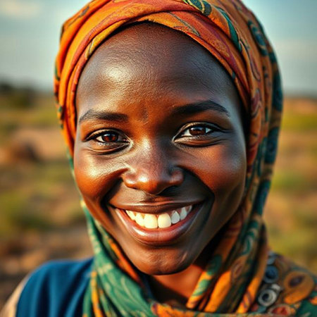 Portrait of a smiling African woman with headscarf.