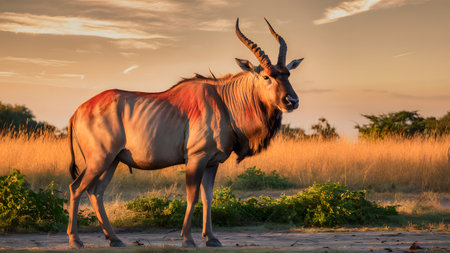 In the tranquil savanna at dusk, a solitary eland stands elegantly among the tall grasses. Its graceful stance captures the serene beauty of the environment, framed by distant trees.