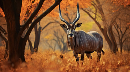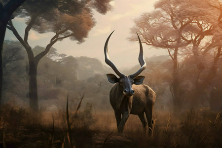 A majestic greater kudu stands in an African savanna at dawn. Serene atmosphere.