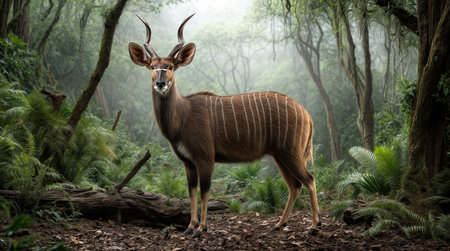 A forest antelope Tragelaphus species standing gracefully in a lush green forest with dense foliage and soft light, showcasing its striped coat and elegant horns in its natural habitat.