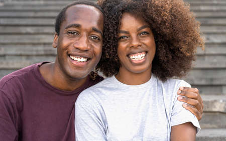 Happy African couple having fun smiling into the camera while sitting on urban stairs