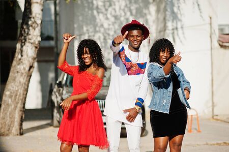 Group of three stylish trendy afro france friends posed at autumn day. Black african man model with two dark skinned womans.