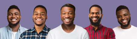 Collage of handsome black guys in casual outfits smiling over purplre studio background, panorama. Creative image of five handsome and cheerful african american young men