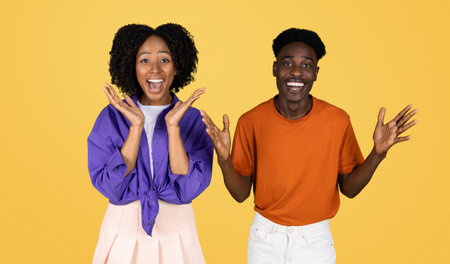 Happy excited surprised millennial husband and wife in casual gesturing with hands